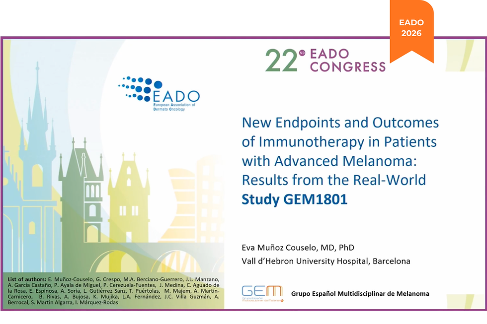 El estudio GEM1801 es un registro prospectivo multicéntrico real-world que analiza los patrones de presentación clínica, opciones de tratamiento y desenlaces clínicos en melanoma metastásico en España. Para esta presentación, el equipo se enfocó en validar dos nuevos endpoints de eficacia: